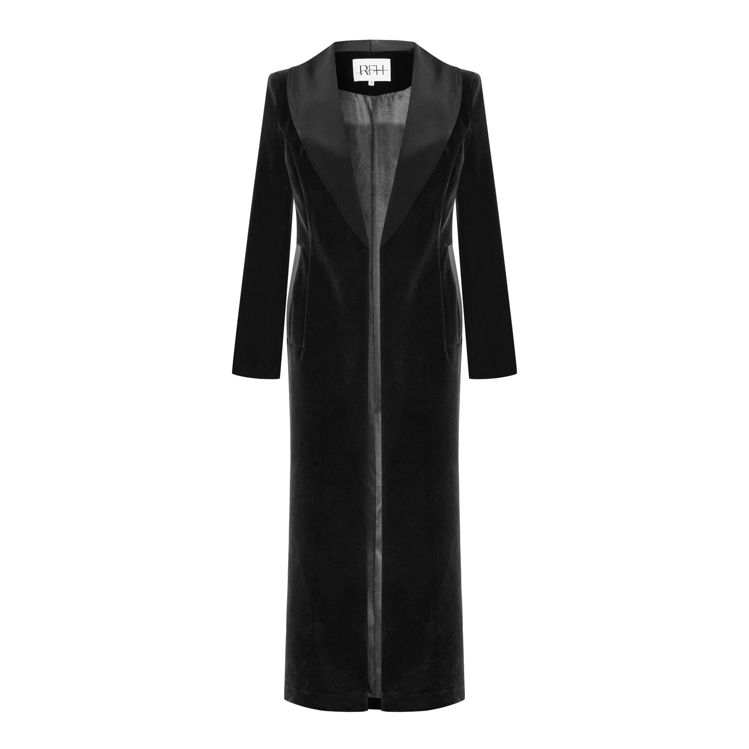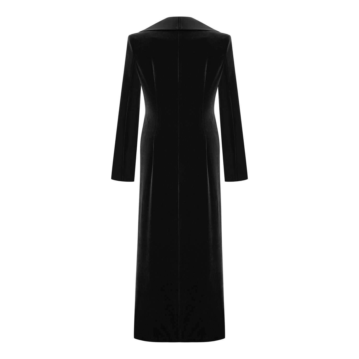 Crafted from rich velvet, Velvet Noble features a long, fluid silhouette elevated by smooth satin detailing along the lapel and front, creating a subtle contrast in texture and shine.