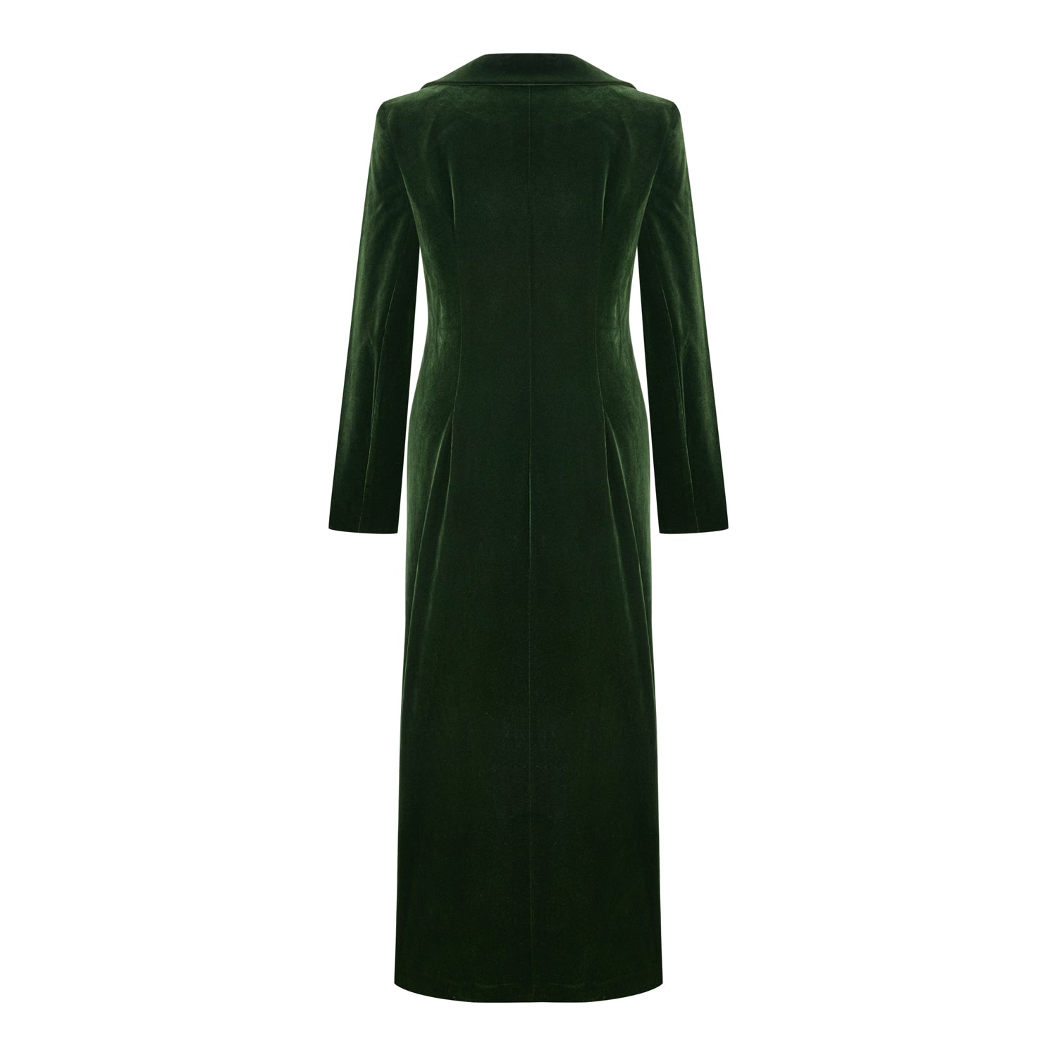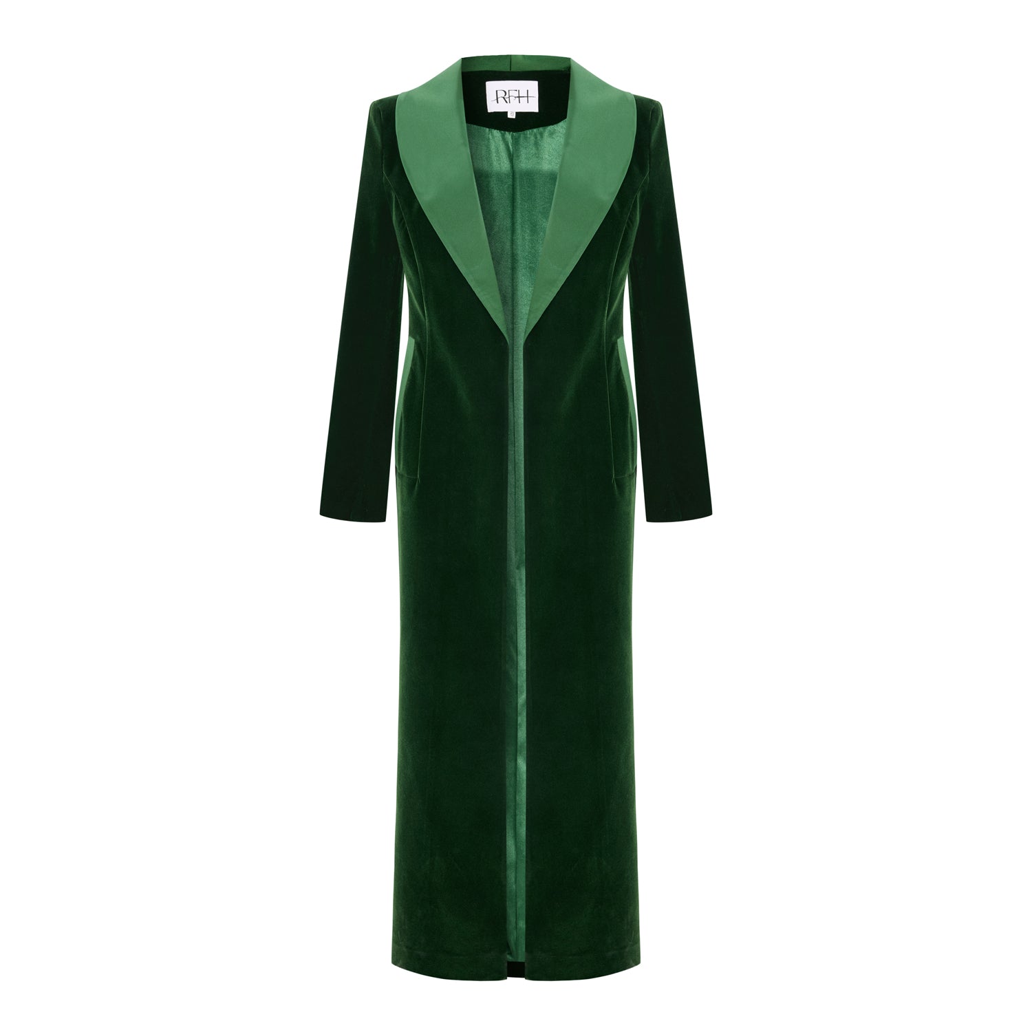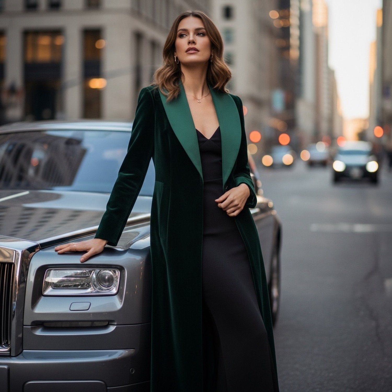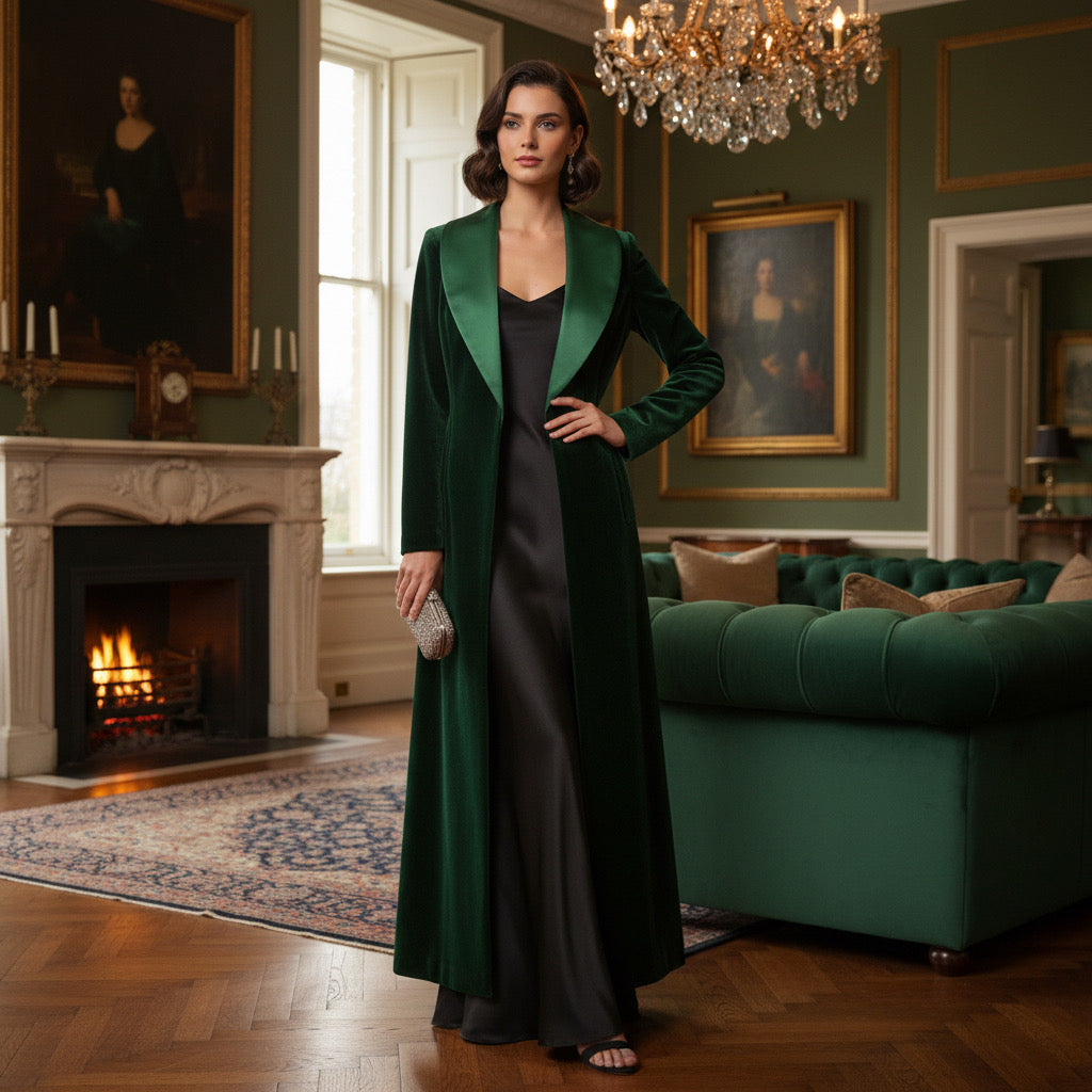 Crafted from rich velvet, Velvet Noble features a long, fluid silhouette elevated by smooth satin detailing along the lapel and front, creating a subtle contrast in texture and shine.