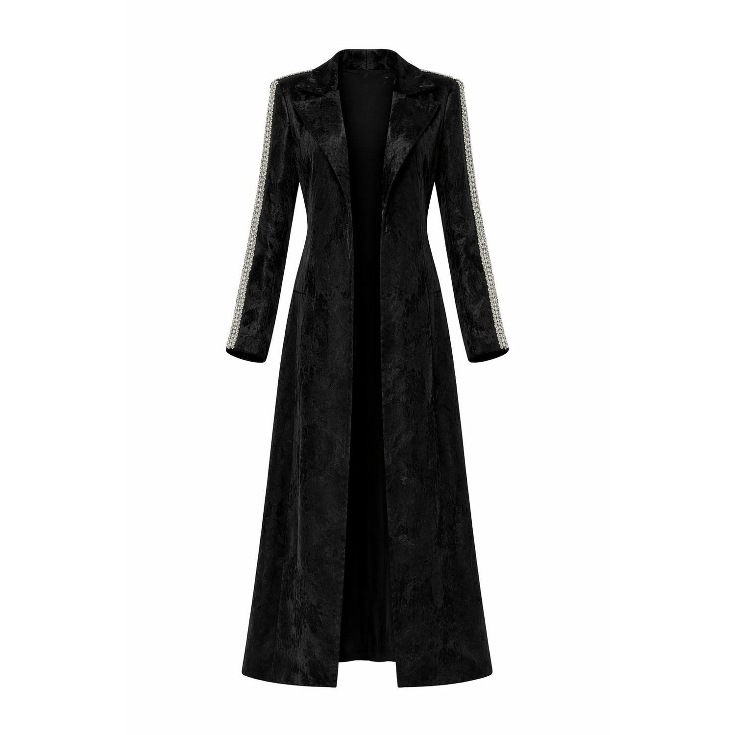 Crafted from black textured velvet, this full-length coat is tailored to create a clean, elongated silhouette.